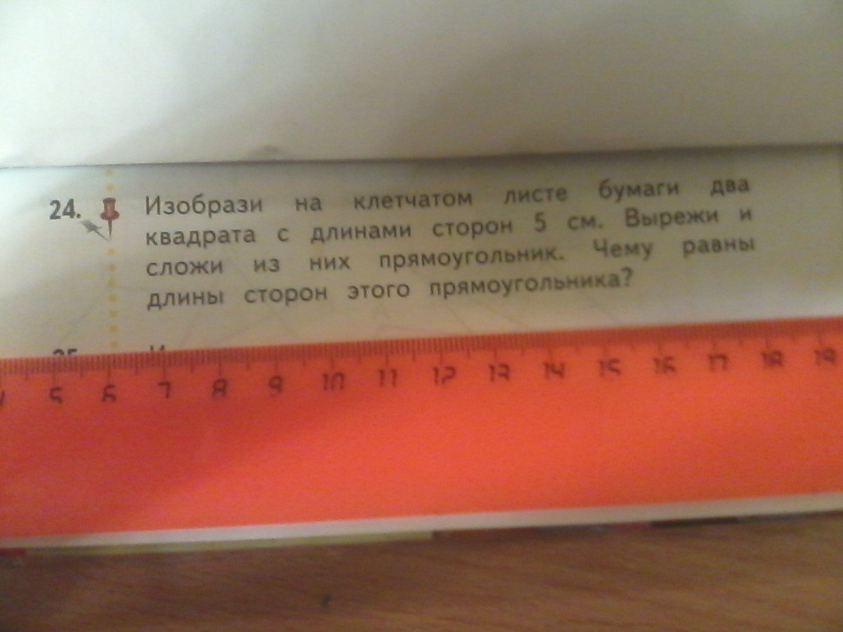 изобрази на клетчатом листе бумаги два квадрата с длинами сторон 5 см. вырежи и сложи из них прямоугольник. чему равны длины сторон этого прямоугольника?