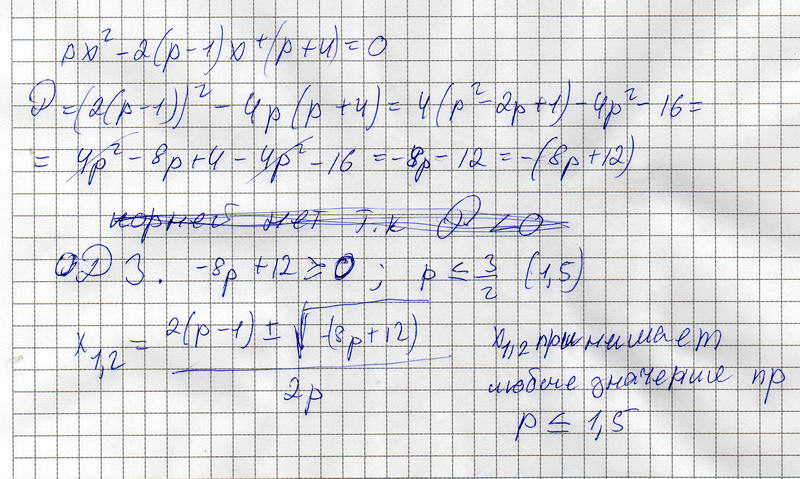 Решите уравнение рх^2-2(р+1)х +р+4=0